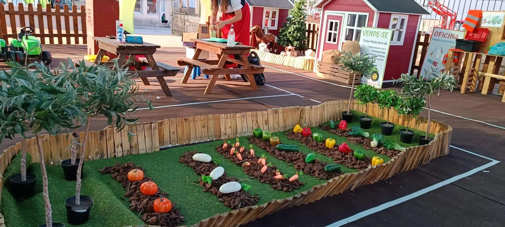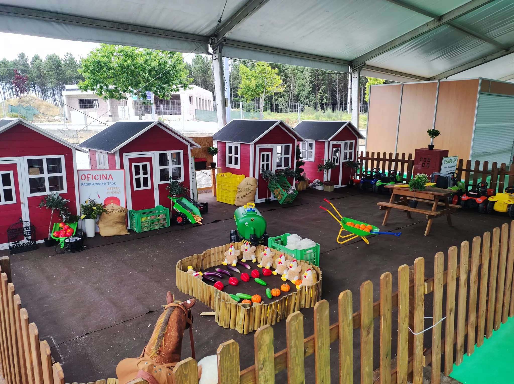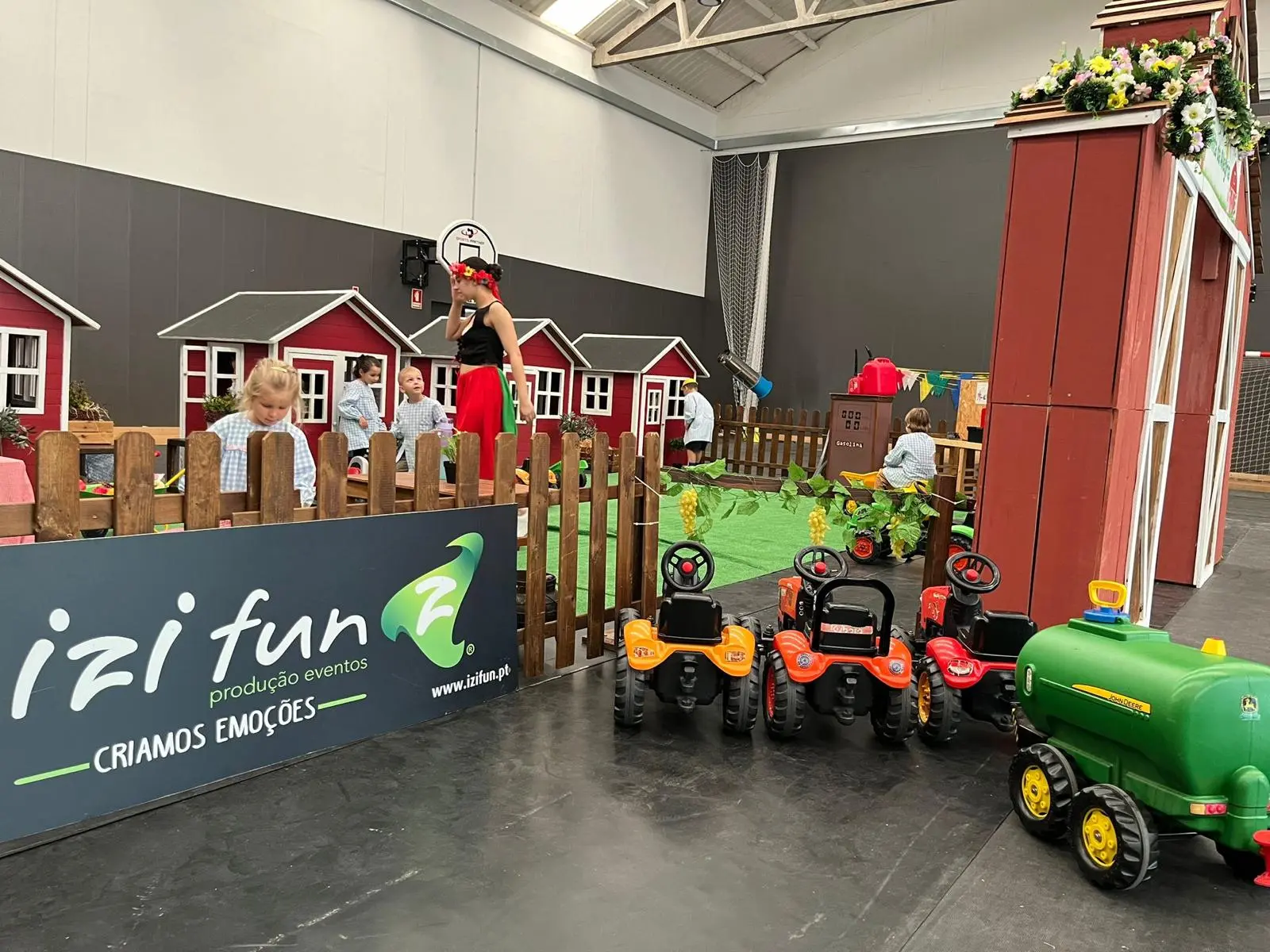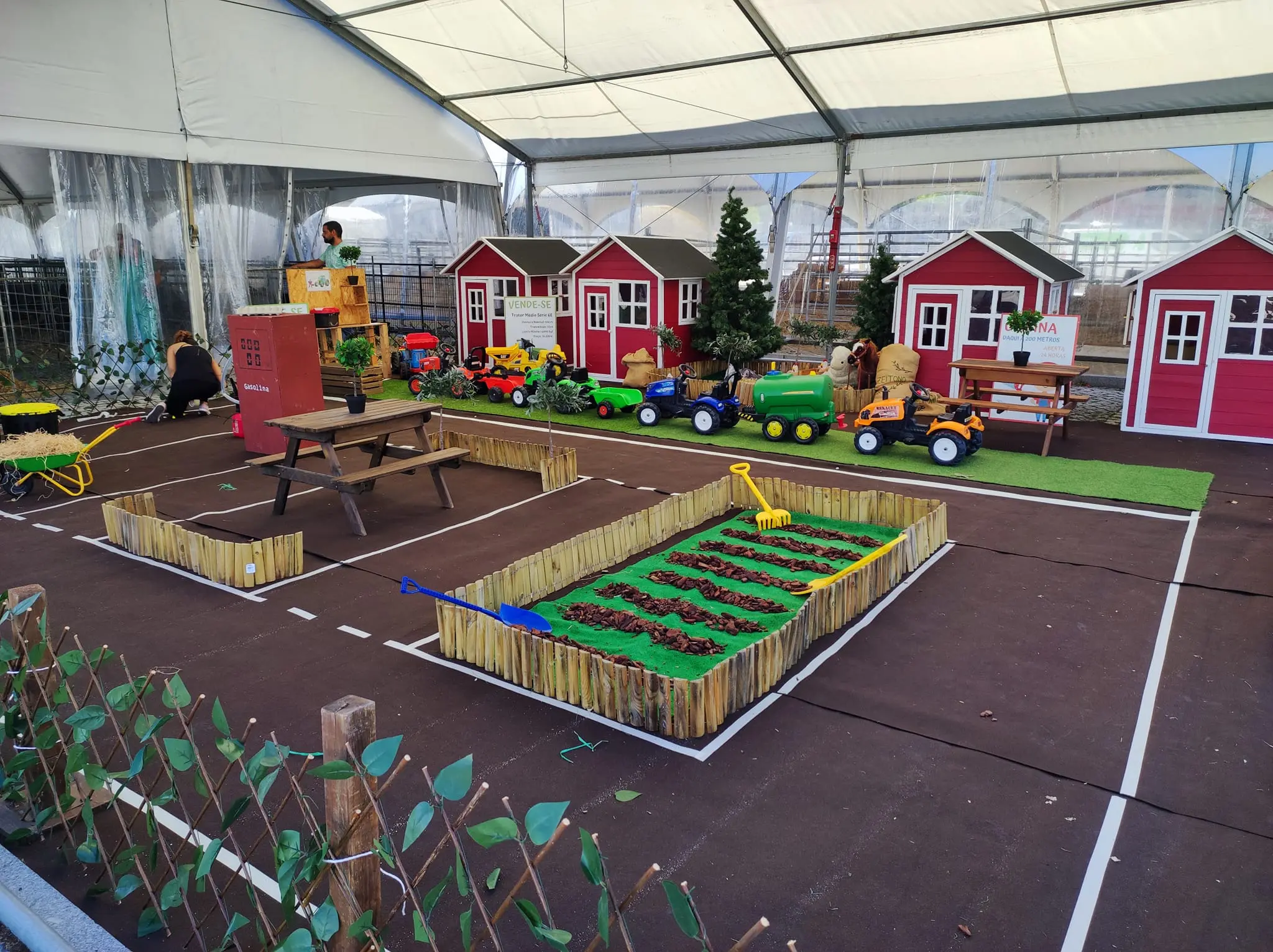 Ela é vedada e decorada e o ponto final são que as crianças podem brincar nos nossos tratores e realizam muitas atividades como pinturas faciais, atelies sustentáveis e atividades criativas para eventos gastronómicos.
