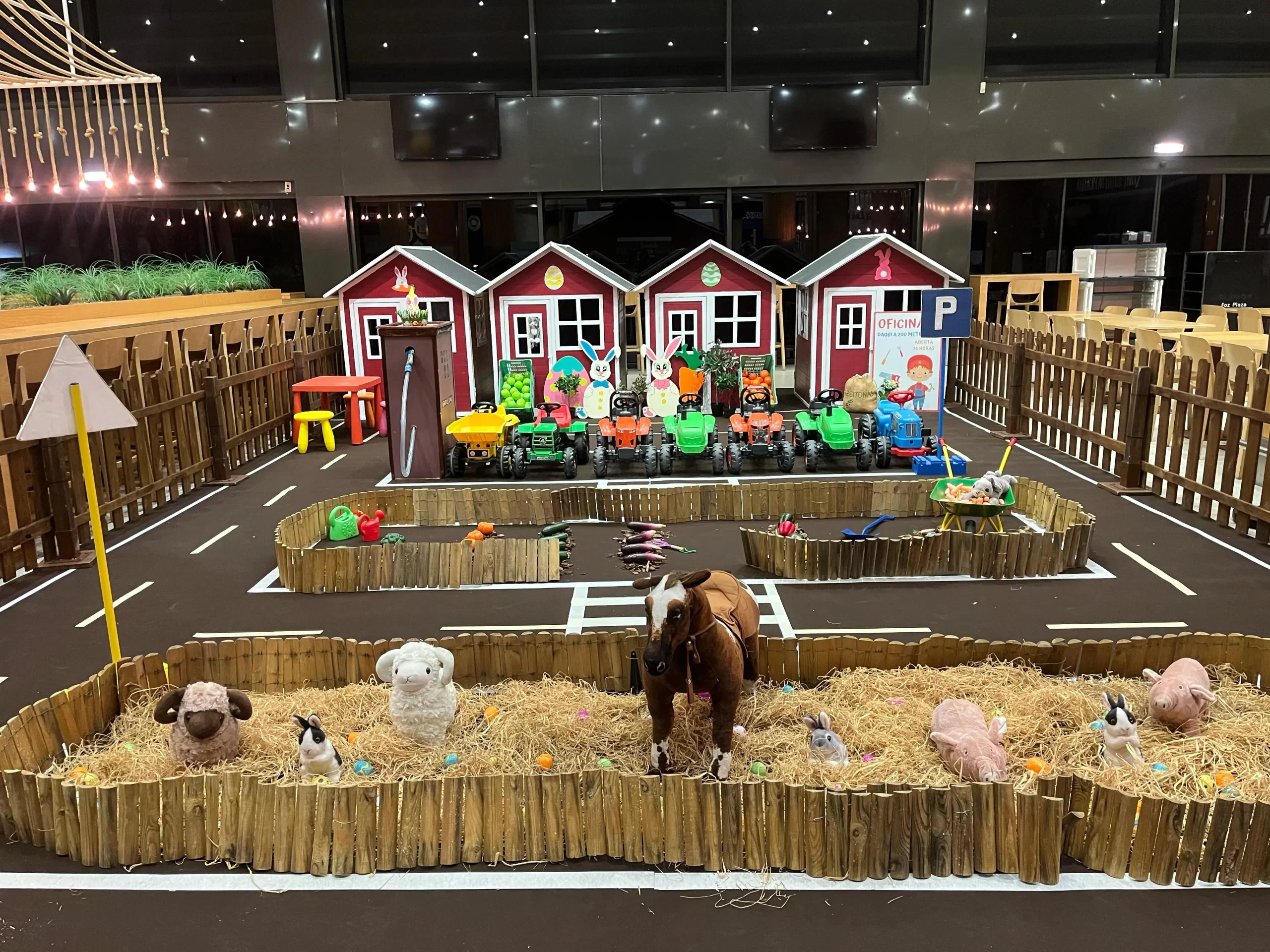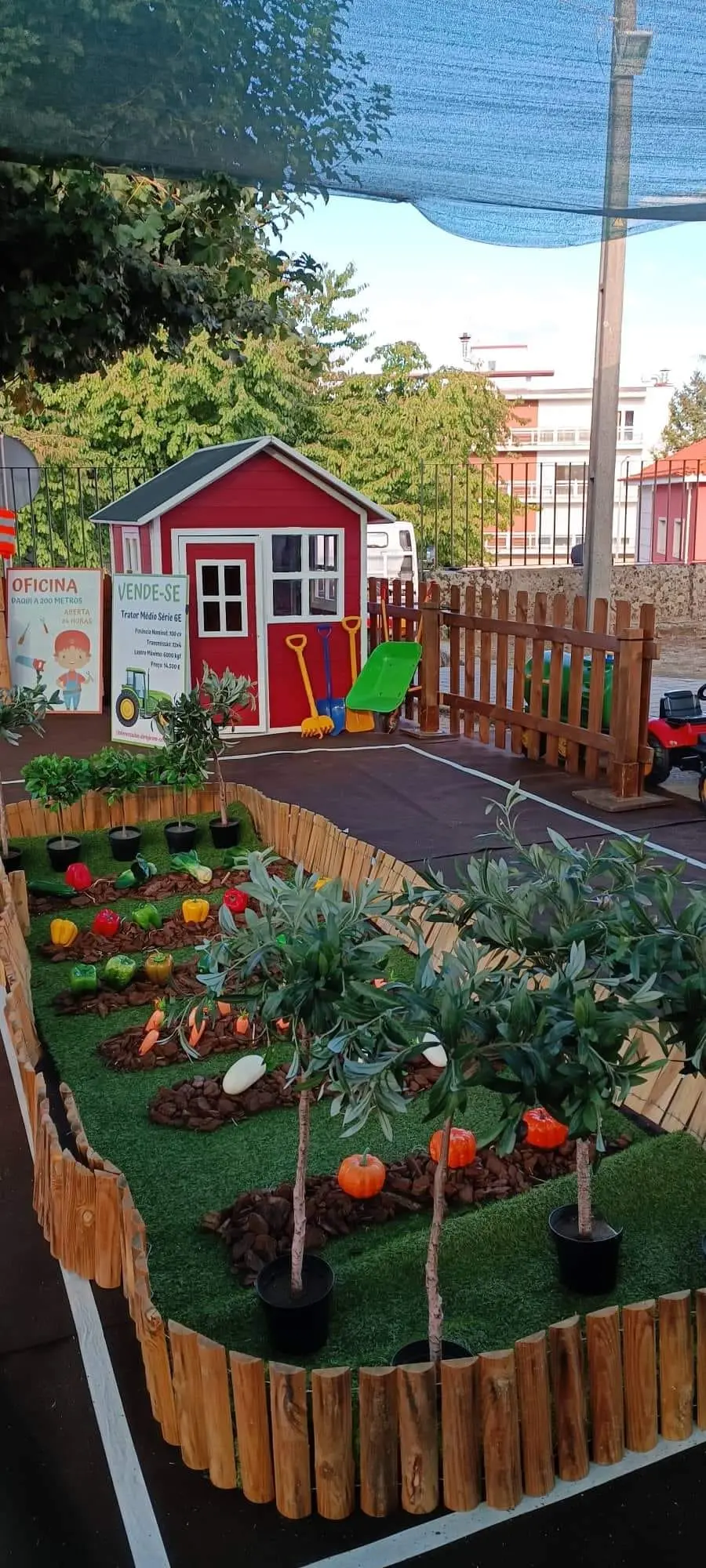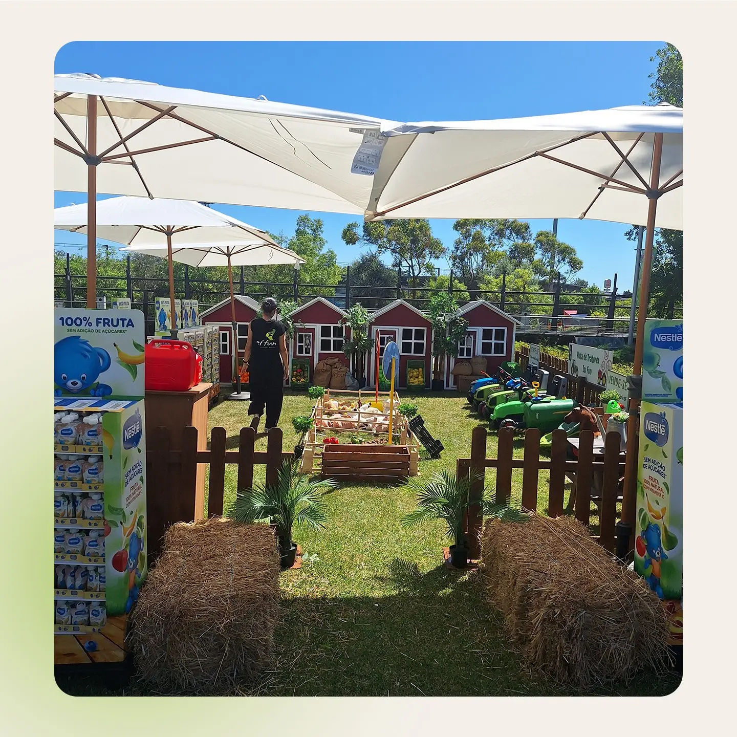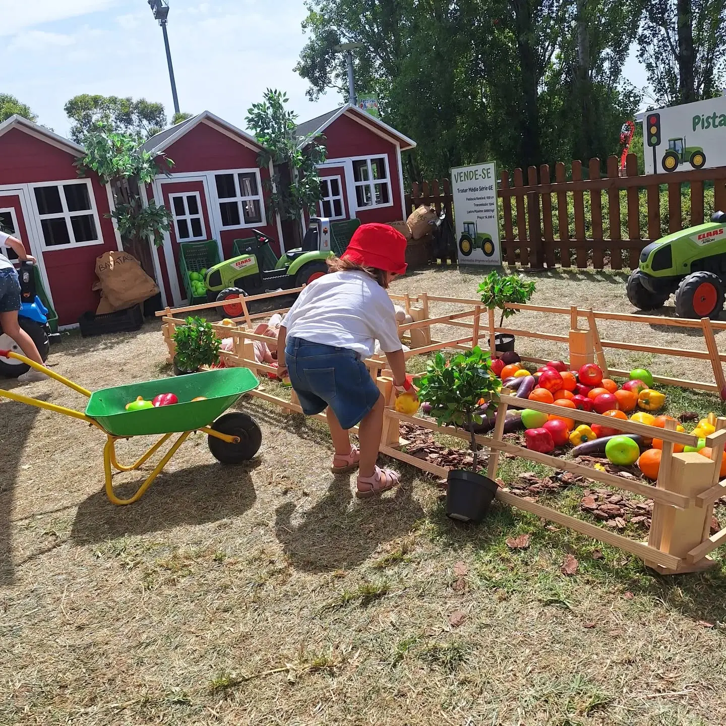 Ela é vedada e decorada e o ponto final são que as crianças podem brincar nos nossos tratores e realizam muitas atividades como pinturas faciais, atelies sustentáveis e atividades criativas para eventos gastronómicos.